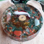 Cette orgonite est composée de différents minéraux sodalite, cristal de roche, sodalite, améthyste …