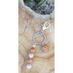 Un porte-clés en bois fossilisé et pierre de chrysanthème.